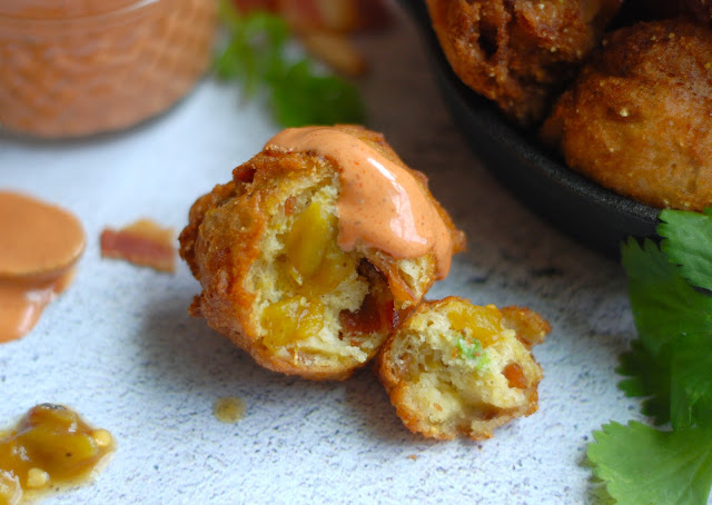 pineapple mango salsa, green chiles, pepper jack cheese and bacon all on a puffy